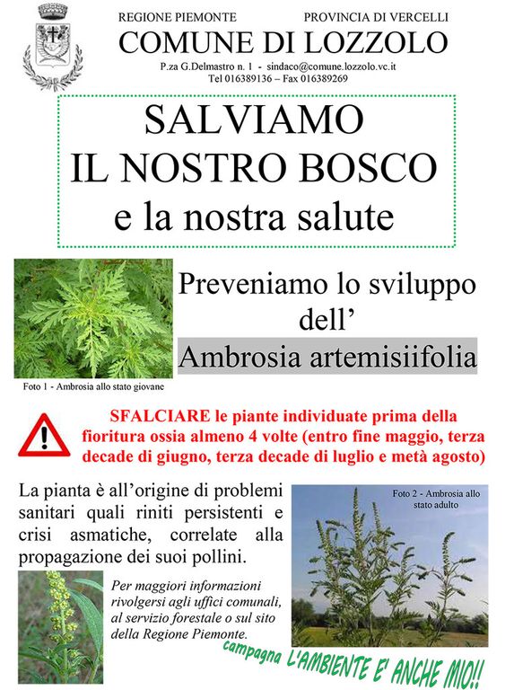 Dopo aver informato la popolazione su Ailanto e Fallopia, l’Amministrazione intende proseguire nell’iniziativa “Salviamo il Bosco” mediante l’affissione di volantini negli esercizi commerciali e la distribuzione di pieghevoli informativi realizzati sulla base di schede monografiche di approfondimento predisposte dalla Regione Piemonte con l’intento di diffondere questa tematica e mettere nelle condizioni la cittadinanza di provvedere al corretto contenimento dell’Ambrosia artemisiifolia, originaria del Nord America, per salvaguardare la nostra biodiversità, le nostre risorse naturali e la nostra salute.