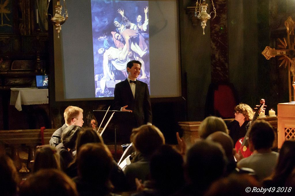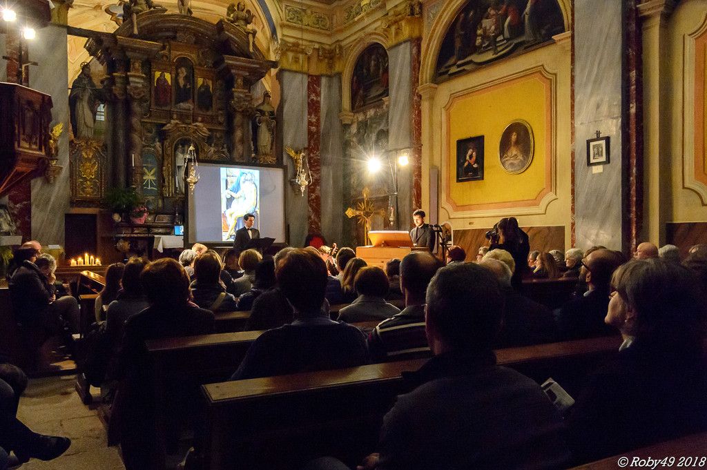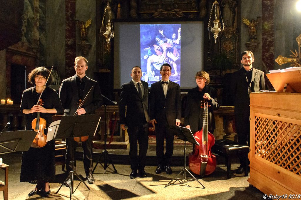 Una Pietà del pittore marchigiano Lorenzo D’Alessandro che denunciava modelli raffaelleschi, un Compianto di Gaudenzio Ferrari, in omaggio all'artista oggetto di studi approfonditi di assoluta attualità tra Varallo, Novara e Vercelli ed una drammatica Deposizione di Caravaggio con citazioni michelangiolesche, hanno realizzato, con il sobrio commento di Nazzareno Menzietti, curatore e regista dell'evento, un puntuale excursus tra il primo Rinascimento ed il periodo barocco, proponendo un confronto figurativo fra le opere che ne evidenziava anche gli aspetti emozionali espressi poi dalla incantevole voce di Nikos Angelis, giovane contro tenore capace di far convivere virtuosismi di altissimo livello tecnico sorretti da una intima intensità espressiva in modo equilibrato ed in perfetta coerenza con il testo di Vivaldi.