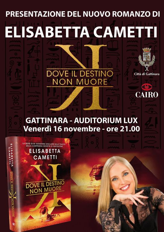 Questa sera, venerdì 16 novembre, alle ore 21.00 presso l’Auditorium Lux di Gattinara sarà presentato “K DOVE IL DESTINO NON MUORE, l’ultimo attesissimo romanzo, pubblicato da Cairo, della signora italiana del thriller, la gattinarese Elisabetta Cametti.