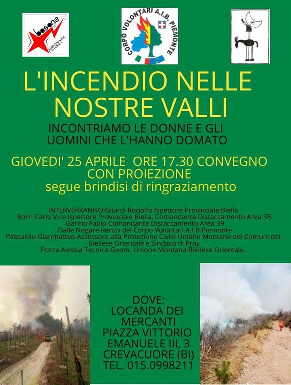Un incendio che ha scottato intere comunità e il territorio tra la Valsessera e la Valsesia. Giovedì 25 aprile a Crevacuore parleranno i protagonisti dell’incendio. Il convegno con proiezione “Incendio nelle nostre valli: incontriamo gli uomini e le donne che lo hanno domato” sarà giovedì 25 aprile alle 17.30 alla Locanda dei Mercanti di Crevacuore, in piazza Vittorio Emanuele II.