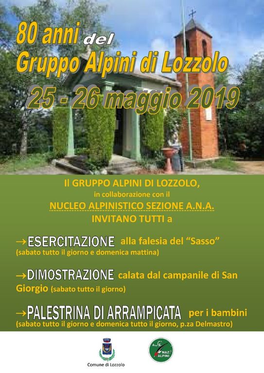 Il Gruppo Alpini di Lozzolo nell’ambito della celebrazione degli 80 anni dalla fondazione propone una due giorni di dimostrazioni ed esercitazioni del Gruppo Alpinistico Sezionale ANA, Primo Raggruppamento.