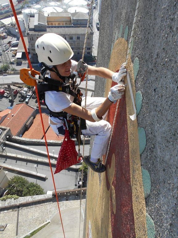 Formento Restauri ha impegnato, nelle varie fasi, da due a quattro persone simultaneamente “in quota”, tra cui una restauratrice professionista, naturalmente qualificata per questa tecnica di lavoro.