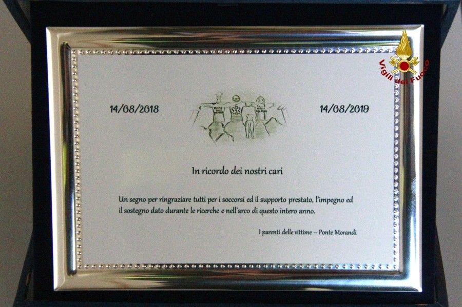 Ieri, 14 Agosto, anniversario del crollo del Ponte Morandi, il Comando Provinciale dei Vigili del Fuoco di Genova ha partecipato alla consegna delle targhe di ringraziamento organizzata dalla Associazione Vittime del Ponte Morandi. Il Comandante Provinciale Fabrizio Piccinini ha ricevuto la targa da Giuseppe, padre di una delle vittime, Luigi Matti Altadonna. Il pubblico presente in sala ha omaggiato i vigili del fuoco con un lungo e caloroso applauso.