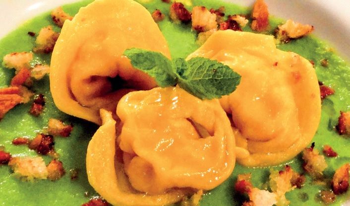 Tortelli ripieni di trota con crema di piselli e olio alla salvia