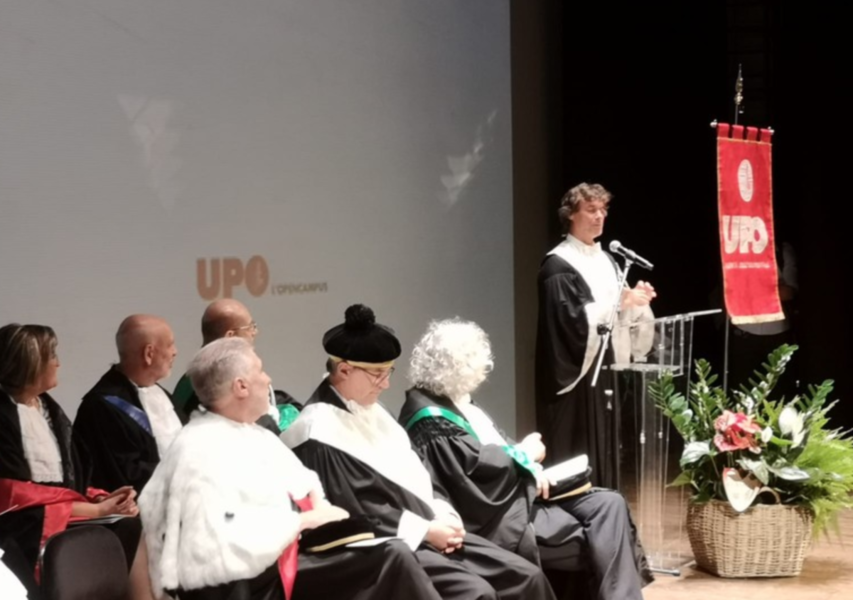 A pronunciare la "laudatio", il discorso nel quale vengono espresse le motivazioni della laurea, é stato il professor Alessandro Barbero, docente di storia medievale all'UPO e da anni collaboratore delle trasmissioni di Alberto Angela e di suo padre Piero, che ha ripercorso la carriera del neolaureato honoris causa.