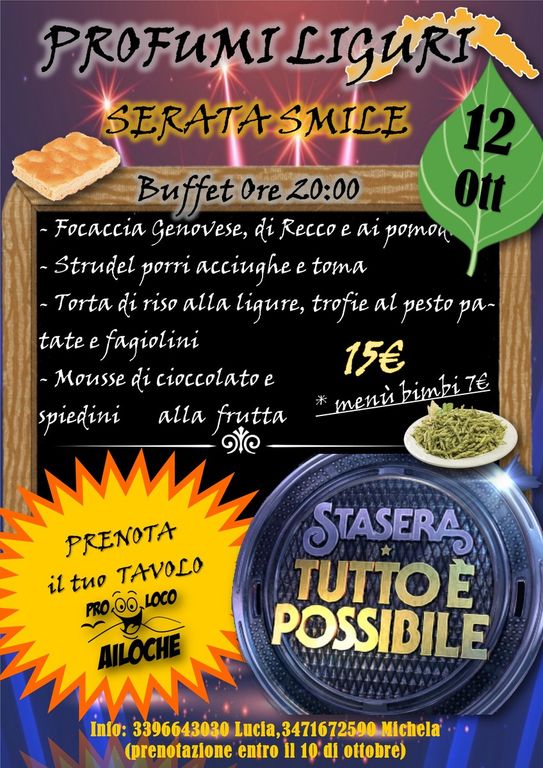 La prima data è sabato 12 ottobre con "Profumi liguri" a partire dalle 20 dove, in prima serata, verrà proposto un clone del noto programma televisivo “Stasera tutto è possibile”, un duello a squadre con giochi per tutti e tutte le età.