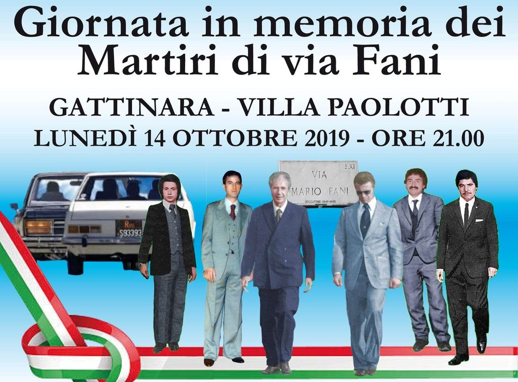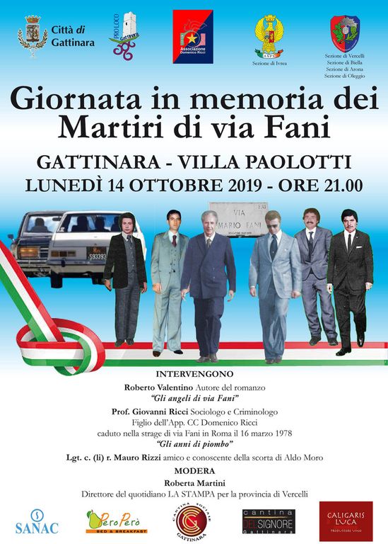 A 41 anni della strage di Via Fani il Comune di Gattinara in collaborazione con Mauro Rizzi, amico e conoscente della scorta di Aldo Moro, organizza per lunedì 14 ottobre in Villa Paolotti, una giornata dedicata alla memoria dei martiri di via Fani, in cui sono Caduti cinque uomini della scorta del presidente Aldo Moro per mano di terroristi senza scrupoli.