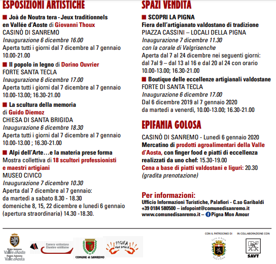 Informazioni www.regione.vda.it/artigianato/default_i.asp Ufficio Informazioni Turistiche – Palafiori, C.so Garibaldi +39 0184 580500 – infopoint@comunedisanremo.it www.comunedisanremo.it – fb: Pigna Mon Amour