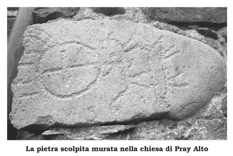 Un manufatto d’epoca mediovale, realizzato rozzamente con uno scalpello od un punteruolo può essere considerato un mistero ancora da decifrare. E’ la rozza incisione su un masso di sienite murato all’esterno della chiesa di sant’Antonio e san Rocco a Pray Alto.