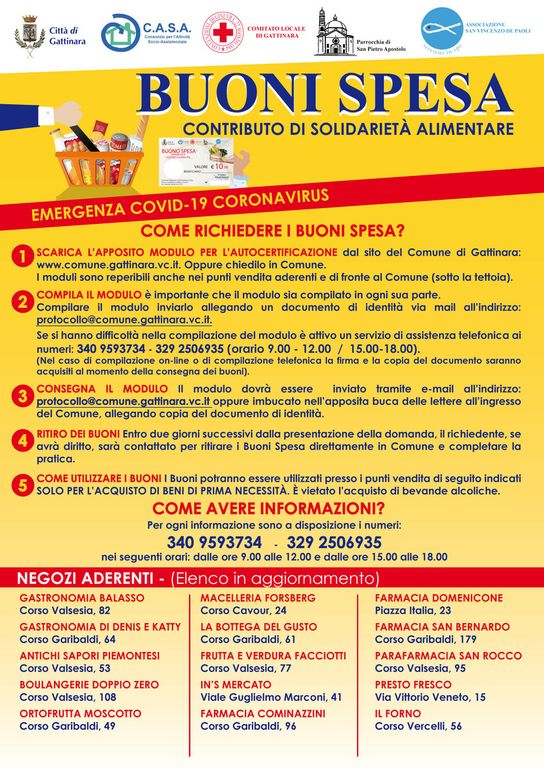 Potranno essere erogati buoni integrativi a nuclei con bambini molto piccoli per acquisto di latte artificiale o pannolini. "Non appena emessa l’Ordinanza della Protezione Civile con le misure straordinarie di sostegno alle famiglie in difficoltà, - spiega il Sindaco Daniele Baglione - ci siamo messi immediatamente al lavoro, insieme a Consorzio C.A.S.A., Croce Rossa, Parrocchia e Associazione San Vincenzo, per dare risposte concrete ai Cittadini fornendo tutte le informazioni necessarie e mettendo a disposizione gli Uffici Comunali per l’assistenza nella compilazione delle domande per la richiesta dei Buoni spesa. Abbiamo predisposto la modulistica scaricabile dal Sito istituzionale del Comune e la stessa è reperibile anche negli esercizi che hanno aderito all’iniziativa e che ritirano i Buoni Spesa. Ovviamente sono misure di sostegno temporanee, che servono ad attenuare le difficoltà economiche delle famiglie per qualche settimana in questa fase di emergenza. Raccolte le domande sarà definito un elenco di beneficiari, a partire da quelli più esposti alle difficoltà economiche inasprite dall'emergenza Coronavirus. Indicativamente i primi Buoni Spesa saranno distribuiti a partire da lunedì 9 aprile".