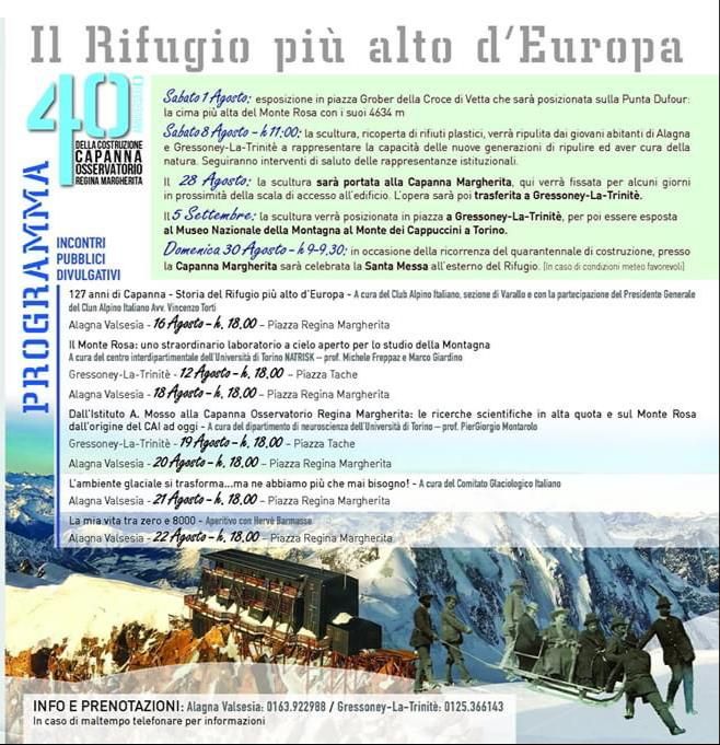 Gli anniversari, in realtà, saranno 2: uno per i 127 anni del rifugio ed un secondo per i 40 anni dell’osservatorio nato al suo interno, utile centro di ricerca scientifica. La struttura è diventata sempre più un esempio di convivenza felice con la natura, essendo stata anche premiata nel 2002 per il suo impatto ridotto sull’ambiente. Il comune di Alagna, in collaborazione con quello di Varallo e di Gressoney, ha comunicato quali saranno gli appuntamenti dell’evento. Per maggiori informazioni sui vari appuntamenti visionare il volantino allegato all’articolo.