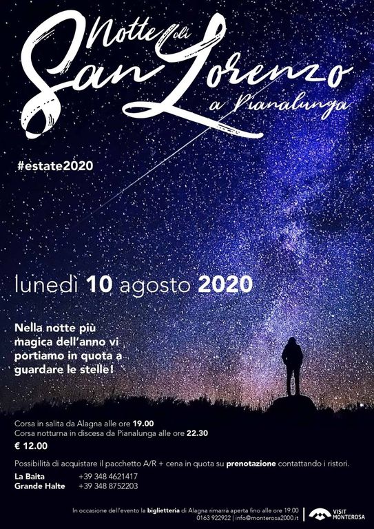 Lunedì 10 agosto, in occasione della notte di San Lorenzo, sarà organizzata una notte stellata a Pianalunga, a 2.046 metri di quota! Sarà possibile raggiungere la località con la telecabina che parte da Alagna; per l'occasione, effettuerà un servizio notturno con una corsa in salita alle 19 e una in discesa alle 22.30. Il prezzo del biglietto di andata e ritorno sarà di euro 12,00. Si potrà scegliere di salire per guardare le stelle nella natura oppure di prenotare un pacchetto comprensivo di viaggio in telecabina e cena in quota; per farlo, basterà contattare i rifugi La Baita (www.baitaseewji.it) e Grande Halte (+39 348 8752203).