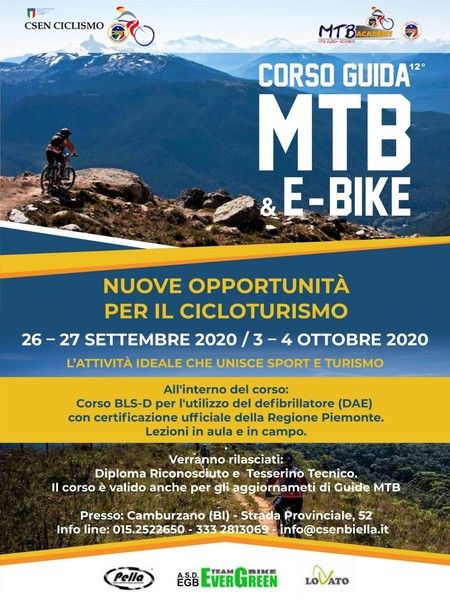 IL 26/27 settembre e 03/04 ottobre a Biella, è previsto il 12° corso per diventare guida Csen e previo superamento dell’esame finale verrà rilasciato il diploma nazionale per l’accompagnamento delle persone in bicicletta fuoristrada. Il programma, è articolato con lezioni teoriche di primo soccorso e DAE, trattamento del partecipante, alimentazione e preparazione fisica, gps e cartografia, meccanica, tecnica di guida e marketing, introdotte da docenti specializzati in materia.