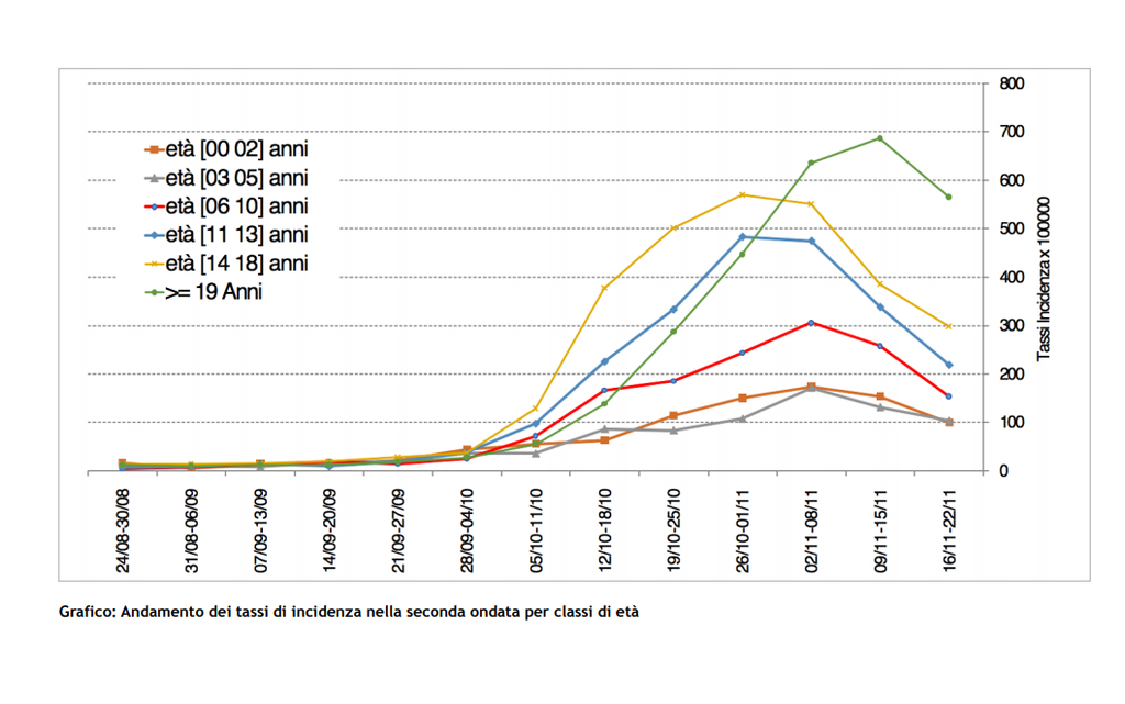 A spiegarlo in modo inequivocabile sono i numeri. Dall’apertura dell’anno scolastico il contagio in età scolare ha avuto un rapido incremento che ha toccato il picco massimo a fine ottobre, con una crescita che è stata esponenziale in particolare dagli 11 ai 18 anni e più graduale e contenuta fino ai 10 anni. Dall’introduzione della didattica a distanza la curva ha invertito la tendenza, evidenziando l’inizio di una fase in discesa. In particolare dal 26 ottobre (data di inizio della didattica a distanza alle superiori) al 22 novembre (settimana del Report che ha portato il Piemonte in zona arancione) i casi di positività nelle fasce 11-13 e 14-18 anni si sono dimezzati, passando da 483 a 218 (ogni 100 mila) nella età scolare delle medie e da 570 a 297 in quella legata alle scuole superiori. In flessione il contagio anche nelle altre fasce di età seppur in forma meno consistente, sia come conseguenza indiretta della dad (con riduzione del rischio di contagio importato dai fratelli maggiori), sia come effetto delle generali misure di contenimento e dell’introduzione della zona rossa. In particolare nella fascia 6-10 anni si è passati da 243 a 153 casi (su 100 mila), nella fascia 0-2 anni da 149 a 98 e in quella 3-5 anni da 107 a 103.
