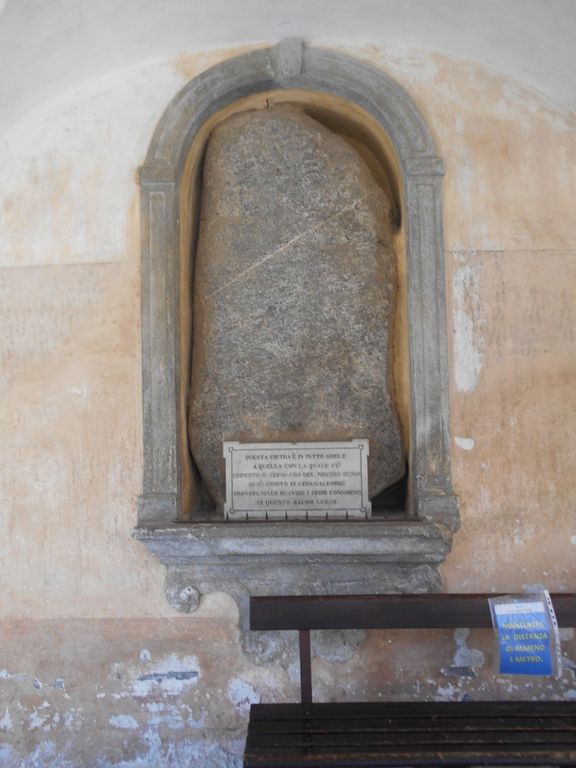 E’ un manufatto litico che un incisione postagli davanti sostiene essere una pietra “in tutto simile a quella colla quale fu coperto il sepolcro del nostro Signore Gesù Cristo in Gerusalemme trovata nello scavare i primi fondamenti di questo sarco luogo”; spiegazione che lascia davvero perplessi perché il grande masso lavorato non ha certo la forma d’una lastra tombale.