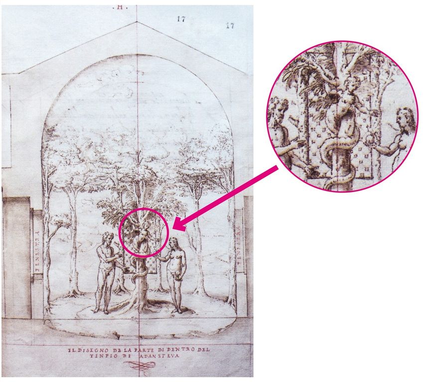 Ma questo tempietto, almeno in un particolare essenziale, risulta difforme da quello previsto da Alessi che, nel disegno del “Libro dei Misteri” aveva dipinto fra Adamo ed Eva un serpente attorciliato attorno ad un albero ma... col volto d’un fanciullo !