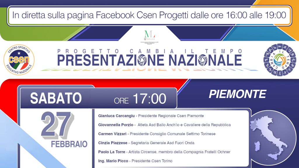Sarà online e si terrà sabato 27 febbraio a partire dalle ore 17 la conferenza stampa di presentazione del progetto regionale "Cambia il tempo", a cura di Csen Piemonte. Ospiti della diretta saranno Carmen Vizzari, presidente del Consiglio Comunale di Settimo Torinese; Giovannella Porzio, Cavaliere della Repubblica e straordinaria Ballerina dell'Asd Ballo Anch'io; Cinzia Piazzese, segretario Generale di Fuori Onda Asd Torino; Paolo la Torre, artista circense membro della compagnia I Fratelli Ochner; Mario Picco Presidente Csen Torino e Gianluca Carcangiu Presidente regionale dello Csen Piemonte. La diretta andrà in onda sulla pagina Facebook https://www.facebook.com/csenprogetti.it.