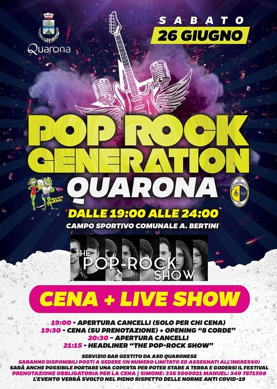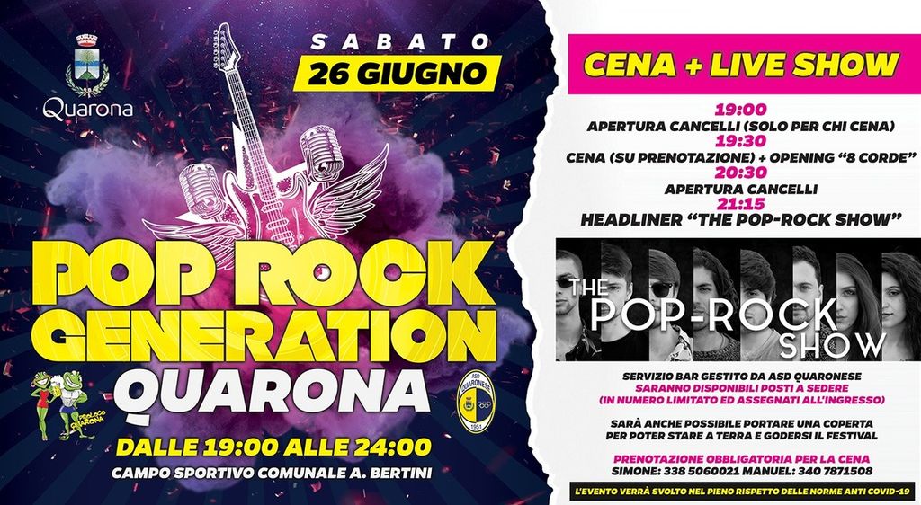 Dopo un lungo periodo di stop, per iniziare a dare qualche segno di ripartenza si è pensato di inaugurare questa nuova stagione estiva con il festival “Pop-Rock Generation”, pensato inoltre per festeggiare la Festa europea della Musica. Il nome dell'evento è riferito alla tematica musicale che farà da contorno a tutta la serata. Infatti la band, composta da ragazzi del Conservatorio Pop-Rock “G. Verdi” di Milano provenienti da diverse parti d'Italia, proporrà un repertorio ricco di brani che hanno formato negli anni il carattere di questo genere musicale, suonando i singoli delle rock band più celebri e amate, passando poi dal rock-blues fino ad arrivare al pop. Vale la pena sottolineare quindi l'alta qualità musicale protagonista del festival. L'evento inizierà a partire dalle ore 19:00 per le persone che verranno a cena (per la quale è obbligatoria la prenotazione) accompagnata dal duo acustico formato da Enrico Vinzia e Paolo Rastelli.