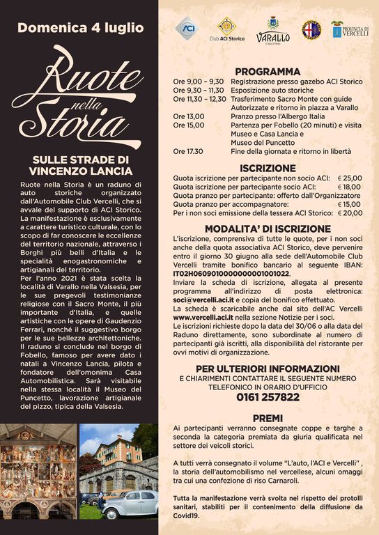L’Automobile Club Vercelli è lieta di presentare “Ruote nella Storia” manifestazione ideata e promossa sul territorio nazionale da ACI Storico, con lo scopo di unire nello stesso connubio, la passione per il motorismo storico, e la conoscenza dei luoghi della nostra penisola, cosiddetti minori, ma che non hanno nulla da invidiare alle grandi città, sia per la loro bellezza, storia, arte e architettura, che per i prodotti tipici dell’artigianato locale e quelli enogastronomici, viene ospitata quest’anno nella provincia di Vercelli a Varallo, cittadina della Valsesia, famosa per il suo Sacro Monte, detto la Gerusalemme d’Italia, definito il più importante a livello nazionale, luogo ricco di spiritualità e delle opere di Gaudenzio Ferrari, pittore rinascimentale che qui ha operato e lasciato opere di straordinaria bellezza.