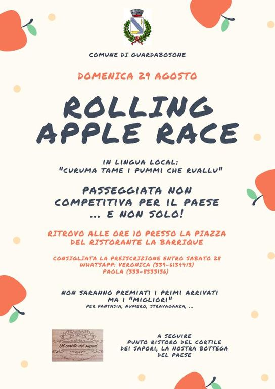 Ad anni di distanza dalla mitica Corsa delle Mele, Domenica 29 Agosto Guardabosone propone: ROLLING APPLE RACE, “curuma tame i pummi che ruallu” Passeggiata non competitiva per il paese e non solo!