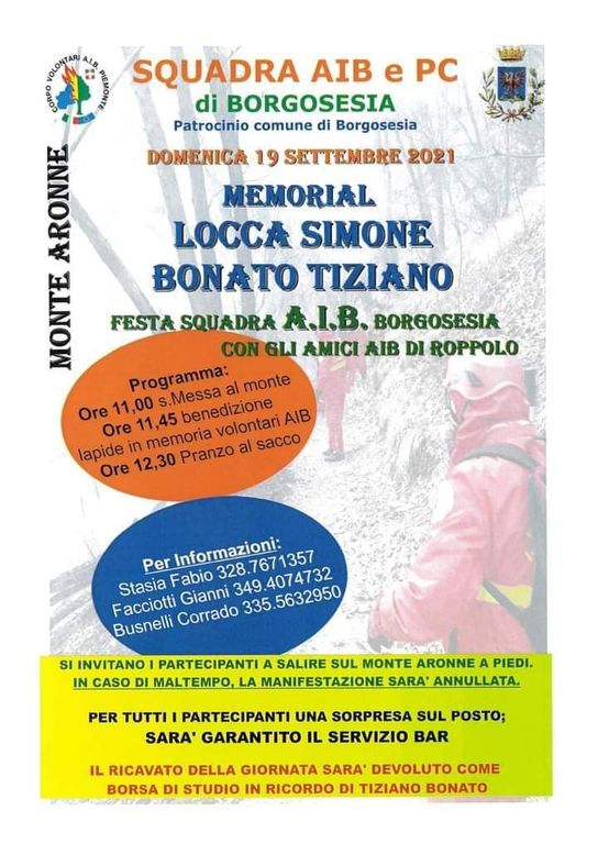 Domenica 19 settembre il monte Aronne di Borgosesia ospiterà il Memorial Locca Simone e Bonato Tiziano, rispettivamente volontari della squadra di Borgosesia e di Roppolo.