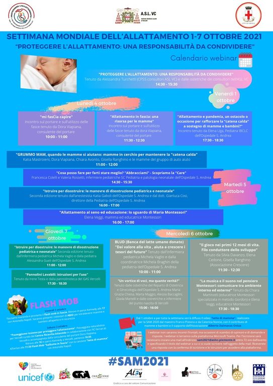 “Anche quest’anno le proposte di webinar in occasione della SAM sono tantissime: parleremo di allattamento, di pandemia, di portare in fascia e di pannolini, ma anche di cura, contenimento, gioco e musica, di dono e della banca del latte e terremo due webinar sulla disostruzione, argomento sempre molto sentito dalle famiglie. La formula del webinar permette a tutti gli interessati agli argomenti, anche non vercellesi, di partecipare in maniera interattiva dialogando e domandando. L’anno scorso questa formula ha avuto un grande successo che speriamo si ripeta. La presenza e il vedersi, anche se distanziati, è però indispensabile per mantenere la “catena calda” dell’allattamento e lo faremo trovandoci per una merenda con le mamme del gruppo di auto mutuo aiuto il venerdì pomeriggio e facendo insieme una bella passeggiata e il classico flash mob cantando e ballando in fascia la mattina di sabato 2 ottobre.