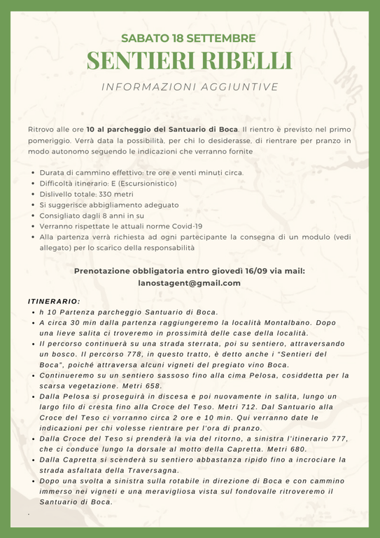 Alle ore 10 i partecipanti, radunati al parcheggio del santuario del Boca, si dirigeranno verso località Montalbano. Dopo averne esplorato i paesaggi e i sentieri si procederà in direzione della cima Pelosa, a 658 metri di altezza, per poi scendere e risalire fino alla Croce del Teso dove verranno date indicazioni a chiunque volesse rientrare entro l’ora di pranzo. Il vero e proprio percorso di ritorno si muoverà in direzione del motto della Capretta, scendendo fino all’incrocio con la strada della Traversagna. In conclusione, una passeggiata tra i vigneti culminerà al punto di partenza del santuario del Boca.