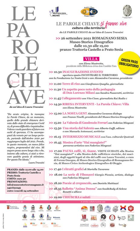 Il Museo Storico Etnografico della Villa Caccia di Romagnano Sesia ospita una delle due tappe dell'evento “LE PAROLE CHIAVE da un'idea di Laura Travaini”, rassegna culturale che è pronta a rientrare in scena nell'inedita versione LE PAROLE CHIAVE SI FANNO VIVE. cultura cibo territorio, con la consapevolezza che i dieci mesi di collegamenti da remoto sulla piattaforma Zoom, da ottobre 2020 a luglio 2021, hanno confermato il suo essere costantemente partecipata e seguita.
