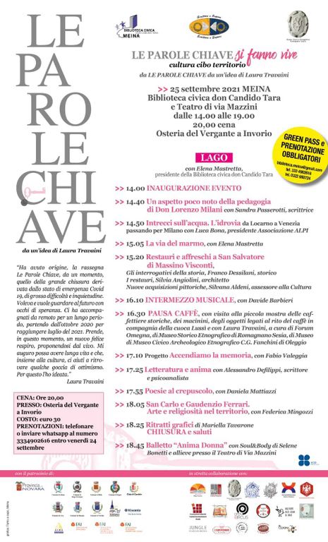 Il 25 settembre le PAROLE CHIAVE fanno tappa alla Biblioteca civica don Candido Tara e al Teatro di via Mazzini MEINA, dalle 14.00 alle 19.00, per poi spostarsi alle 20,00, per la cena, all'Osteria del Vergante a Invorio.