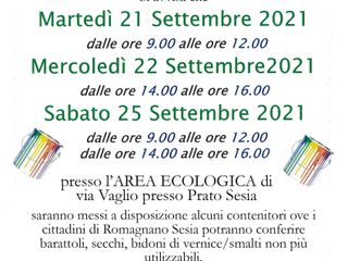 Sabato 25 settembre, dalle ore 9 alle 12 e dalle 14 alle 16, sarà l’ultima occasione per i residenti di Romagnano e dintorni di smaltire in sicurezza i rifiuti collegati alla vernice. In via Vaglio, presso l’area ecologica, i cittadini potranno trovare dei contenitori appositamente dedicati a vecchi barattoli, secchi o bidoni di vernice non più utilizzati.