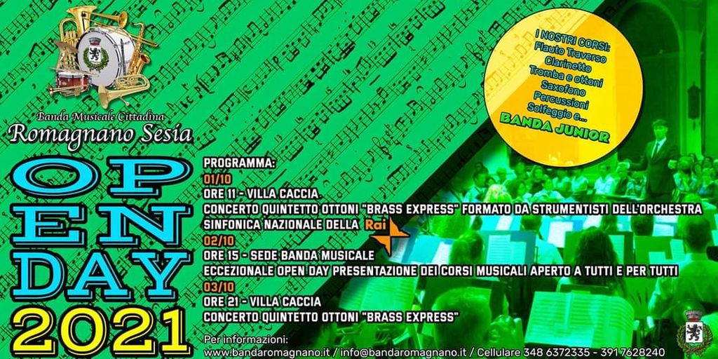 Venerdì 1 Ottobre dalle 9,00 in poi, la Banda Musicale cittadina apre le sue porte ai bambini della scuola elementare(Via Novara 75, Romagnano Sesia). I bambini avranno modo di avvicinarsi alla musica e alle attività della banda e soprattutto di provare con mano e fiato i vari strumenti che compongono l’organico. Questa non è una novità, perché la Banda ha da anni una scuola musicale, mettendo a disposizione maestri di strumento per i bambini, ragazzi e adulti che ne vogliono far parte. Ogni anno perciò organizza Open Day, anche il collaborazione con le scuole del paese. La vera novità sta nella fortuna di poter avere a Romagnano Sesia la presenza del Quintetto. Alle undici sarà il turno dei ragazzi delle scuole medie , in Villa Caccia – avranno l’occasione di conoscere più da vicino la Banda del paese e ascoltare il Quintetto.