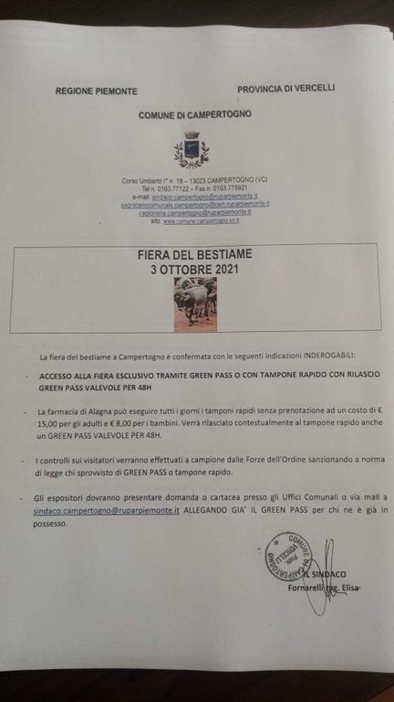 Domani, domenica 3 ottobre, si svolgerà la festa del bestiame di Campertogno, seppur con le dovute precauzioni del caso. L’accesso alla manifestazione è infatti possibile solo se si dispone del Green Pass o di un tampone rapido valido.