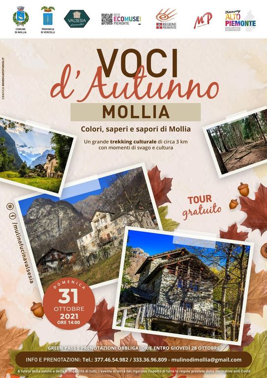 “Voci d’Autunno” è un maxi tour che coniuga il trekking alla cultura in una grande passeggiata tematica tra le frazioni di Mollia, realizzato grazie al sostegno della Provincia di Vercelli.