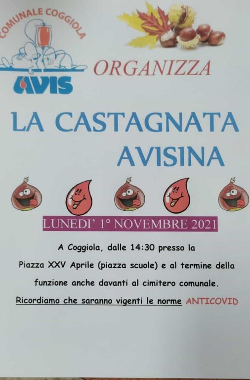 Proseguono le castagnate nei Comuni del territorio biellese. A Coggiola sarà l’Avis a gestire l’evento del 1° novembre (da qui il nome di “castagnata avisina”), in partenza alle ore 14:30 presso piazza XXV Aprile che, al termine della funzione celebrativa, sarà ospitato davanti al cimitero comunale.