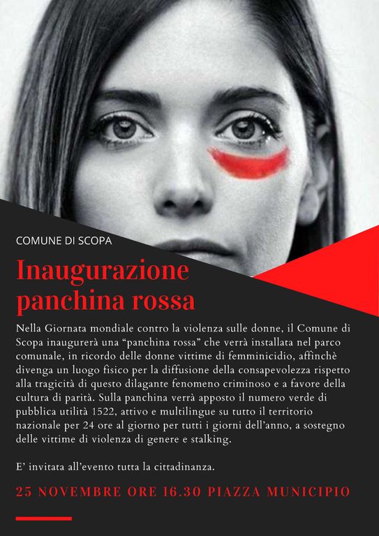 A partire da giovedì 25 novembre, Giornata internazionale per l'eliminazione della violenza contro le donne, anche il Comune di Scopa avrà la sua panchina rossa. L’inaugurazione è programma per le ore 16:30 in piazza Municipio.