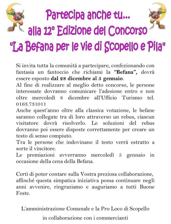 Il concorso “La befana per le vie di Scopello e Pila”, organizzato dall’amministrazione del Comune di Scopello, raggiunge la sua 12esima edizione. I partecipanti sono invitati a realizzare un fantoccio che ricordi la befana e ad esporlo a partire dal 28 dicembre fino al 5 gennaio, giornata in cui avverranno le premiazioni.