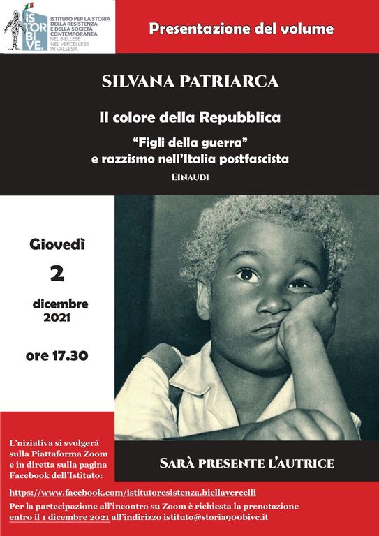 La presentazione del volume di Silvana Patriarca Il colore della Repubblica. “Figli della guerra” e razzismo nell’Italia postfascista, in programma per giovedì 2 dicembre p. v., alle ore 17.30, non potrà essere svolta in presenza nella sede dell’Istituto come inizialmente comunicato, ma sarà invece tenuta a distanza sulla Piattaforma Zoom e in diretta sulla pagina Facebook dell’Istituto: https://www.facebook.com/istitutoresistenza.biellavercelli.