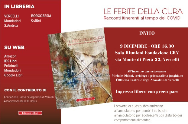 Giovedì 9 dicembre, presso la sala convegni della Fondazione Cassa di Risparmio di Vercelli alle ore 16, si terrà la presentazione del volume scritto dal reparto di psicologia dell'Asl di Vecrelli, intitiolato “Le ferite della cura: racconti itineranti ai tempi del Covid”. Interverranno, la dottoressa Patrizia Colombari, Direttore della SC Psicologia dell'Asl Vc, il dottor Michele Oldani, sociologo e psicoanalista junghiano e l'Officina Teatrale degli Anacoleti di Vercelli. Ingresso libero.