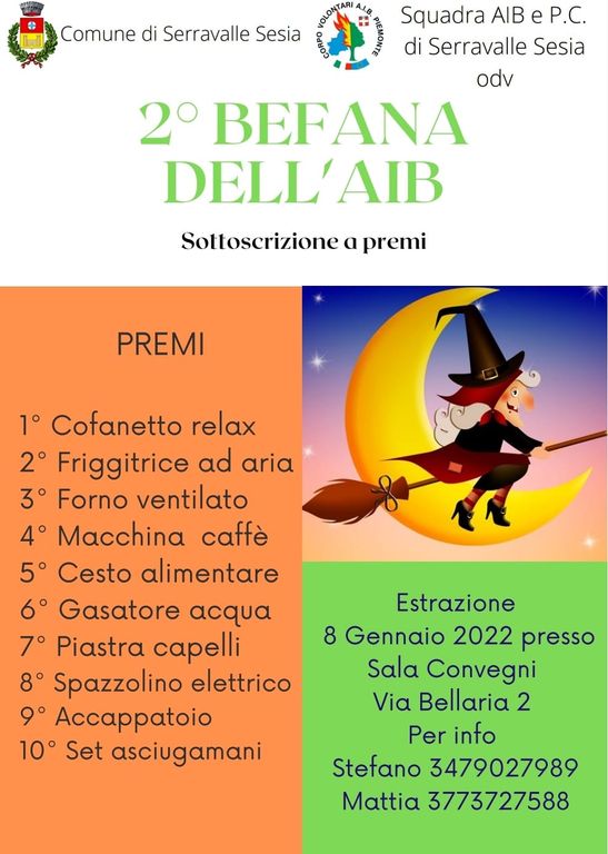 Sabato 8 gennaio, presso la sala convegni di via Bellaria 2, a Serravalle Sesia, si svolgerà la 2° Befana dell’AIB, lotteria ad iscrizione. L’evento, organizzato dalla squadra AIB e P.C. di Serravalle Sesia, in collaborazione con l’amministrazione comunale, offre la possibilità di vincere diversi premi: un cofanetto relax; una friggitrice ad aria; un forno ventilato; una macchina del caffè; un cesto alimentare; un gasatore dell’acqua; una piastra per capelli; uno spazzolino elettrico; un accappatoio e un set di asciugamani.