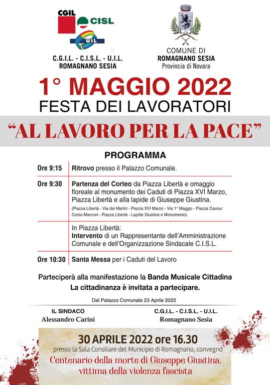 Il primo maggio la oramai storica manifestazione in dei lavoratori e sindacati la mattina con il corteo. Nell'anno del centenario della marcia su Roma, una occasione di risposta pacifica del mondo democratico all'evento che cambiò drammaticamente il destino del nostro Paese.