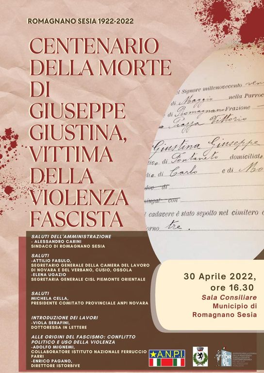 Due importanti appuntamenti nella nostra zona per ricordare il centenario dell'uccisione dell'operaio Giuseppe Giustina a Romagnano Sesia durante la manifestazione del primo maggio da parte di un gruppo di fascisti e l'ascesa del fascismo nel novarese con il Direttore dell'Istituto Storico di Biella e Vercelli Enrico Pagano e lo storico Adolfo Mignemi