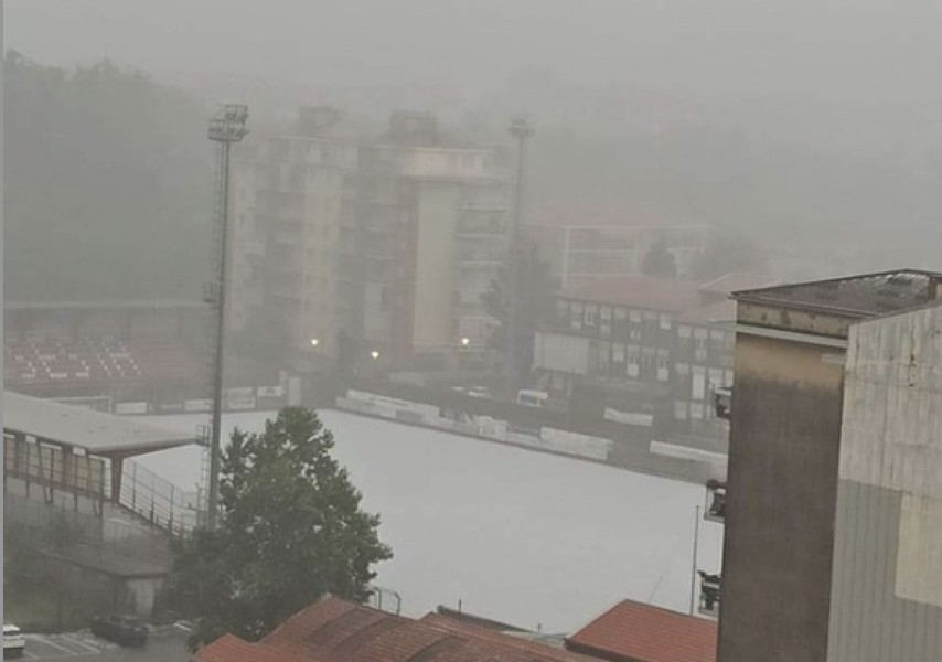 A Borgosesia una tremenda grandinata ha imbiancato le strade depositandosi, come si vede nella foto anche sul campo sportivo.