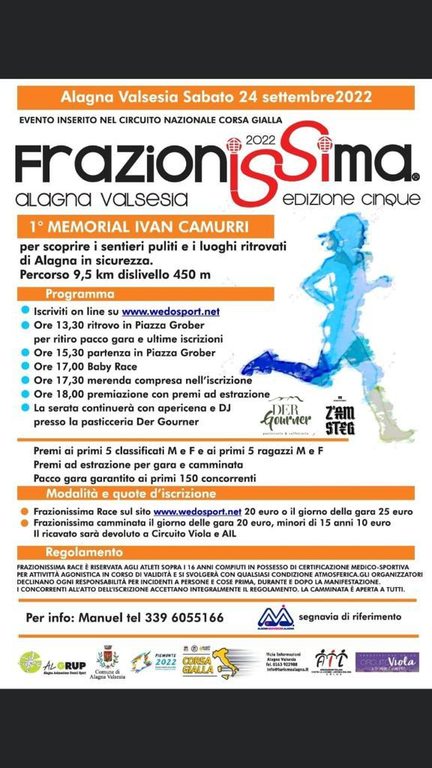 Ad Alagna torna la Frazionissima, alla quinta edizione, che quest'anno sarà dedicata a Ivan Camurri, il campione di corse in montagna prematuramente scomparso a dicembre. Un evento per riscoprire i sentieri puliti e i luoghi ritrovati di Alagna in sicurezza.