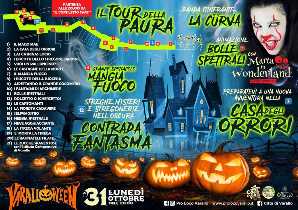 Anche quest’anno ci saranno Il tour della paura, La contrada fantasma, La casa degli orrori, mostri, streghe, maghi e tante altre stregonerie per tutti i bambini. Nelle attività cittadine si potrà fare dolcetto o scherzetto. In programma anche lo spettacolo del Mangiafuoco, la musica della banda itinerante “La Cürva”, le zucche spaventose dell’Istituto Comprensivo di Varallo e l’animazione delle bolle spettrali con Marta in Wonderland.