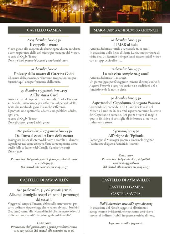 Dal canto loro il Castello Gamba e il castello di Aymavilles sapranno affascinare i propri ospiti con tante proposte per vivere il lato più artistico del Natale: dalle visite-gioco alle passeggiate, dai giochi tematici fino ad attività teatrali dedicate al Christmas Carol di Charles Dickens.