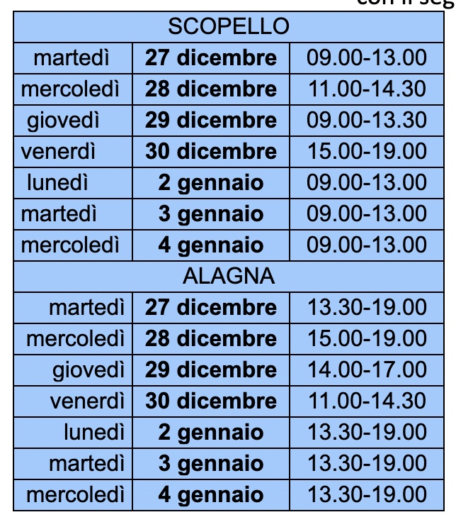 L’attività si svolge all’ambulatorio Asl di Scopello, in via Mera c/o Municipio e al Centro Medico di Alagna, in piazza Ing. C. Rolando nei seguenti giorni: 27 – 28 – 29 – 30 dicembre 20222 – 3 – 4 gennaio 2023.