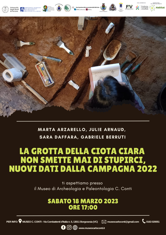 Marta Arzarello, Julie Arnaud, Sara Daffara e Gabriele Berruti del gruppo di ricerca dell'università di Ferrara, che da oltre dieci anni cura gli scavi archeologici nella Grotta della Ciota Ciara, presentano le interessanti novità emerse durante la campagna di scavo 2022. Come recita il titolo dell’incontro la Grotta delle Ciota Ciara infatti non smette di stupire e riserva anche quest’anno nuove sorprese a tutti gli appassionati della materia, agli studiosi, ma anche a tutti quelli che vogliono conoscere in modo scientifico e approfondito, attraverso i reperti archeologici, le origini di un territorio dal passato antichissimo.