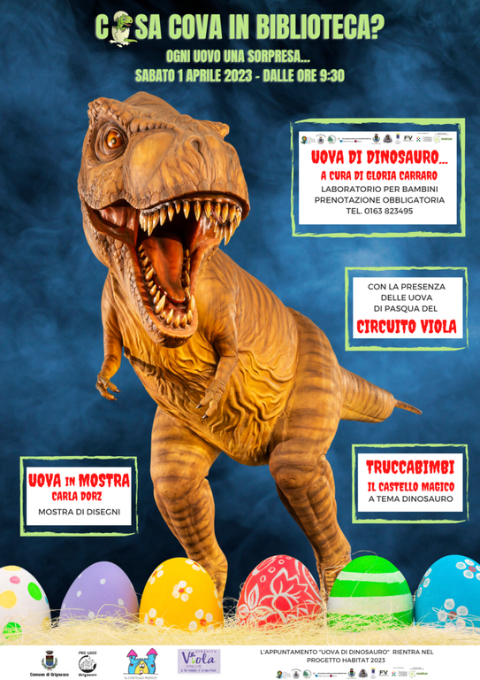 Uova come “uova di dinosauro”: questo infatti il tema dei laboratori di Gloria Carraro (già apprezzatissima per la sua “giornata da archeologo”) e Francesca Tribbia, che consentiranno ai più piccoli, fra scienza e divertimento, di scoprire il magico mondo di questi grandiosi animali estinti, nei quali i più coraggiosi potranno trasformarsi grazie al colorato trucca-bimbi del Castello Magico.