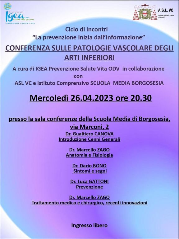 Mercoledì 26 aprile, alle ore 20.30, presso la Sala Conferenze della Scuola Media di Borgosesia (Via Marconi n. 2) si terrà una conferenza dedicata alle “Patologie vascolari degli arti inferiori”, organizzata da Igea-Prevenzione-Salute-Vita Odv, in collaborazione con l'ASL di Vercelli e l’Istituto Comprensivo Scuola Media di Borgosesia.