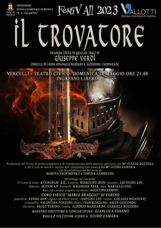I concerti in calendario - Le tre serate propongono un viaggio alla scoperta delle contaminazioni musicali, come mezzo di comunicazione ed espressione dei bisogni e delle emozioni del proprio tempo. Si comincia venerdì 26 maggio con gli allievi del Ensemble Fiati in collaborazione con il Coro della Scuola Primaria “Scuole Cristiane” di Vercelli, si prosegue con l’Ensemble Pop Rock, la Banda Saxotti, il Wednesday Jazz Quintet, il Soultown Lab e i gruppi del Let’s play Together. Una serata all’insegna della musica moderna, jazz, pop e rock in cui gli allievi daranno prova di energia e potenza musicale. Farete fatica a stare fermi sulle poltrone! Sabato 27 sarà la volta dei Drummers’ Collective, l’Ensemble Ottoni, il Coro di voci Bianche, i Kinder Music, l’Ensemble Archi, l’Ensemble Flauti, il gruppo Sound Design e per finire la Colours Jazz Orchestra. Otto gruppi che camminano su un filo sottile che dalla classica conduce alla musica moderna. Otto gruppi composti da studenti di tutte le età in un mix di tenerezza e autenticità. Domenica 28 maggio ultima serata dedicata all’opera lirica, una produzione di eccellenza degli allievi del Corso di Perfezionamento dello Spartito Operistico del Maestro Fulvio Bottega, fiore all’occhiello dell’offerta formativa della Scuola Vallotti. Con la direzione scenica del Maestro Guido Zamara, la partecipazione del Coro della “Compagnia Mario Broggio” diretto dal Maestro Gianluca Fasano, la classe di danza della Maestra Marina Trofimenko, la classe di canto lirico della Maestra Simona Zambruo e l’orchestrazione di alcuni docenti della Scuola Vallotti andrà in scena “Il Trovatore” di Giuseppe Verdi. Gli allievi del corso di perfezionamento dello spartito operistico, ci racconteranno con un bel canto espressivo, fiammeggianti passioni come l’amore, la gelosia, la vendetta e l’odio.